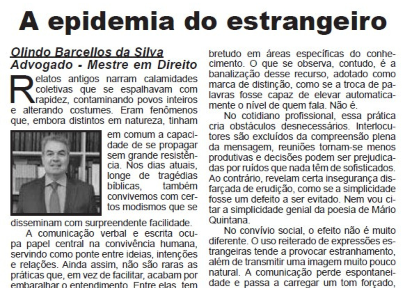 Novo artigo de nosso sócio diretor, Dr. Olindo Barcellos da Silva, publicado no Jornal Gazeta Mineira do dia 24/04/2026
