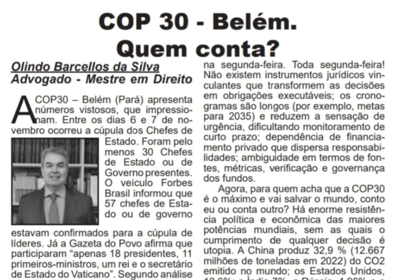 Novo artigo de nosso sócio diretor, Dr. Olindo Barcellos da Silva, publicado no Jornal Gazeta Mineira do dia 14/11/2025