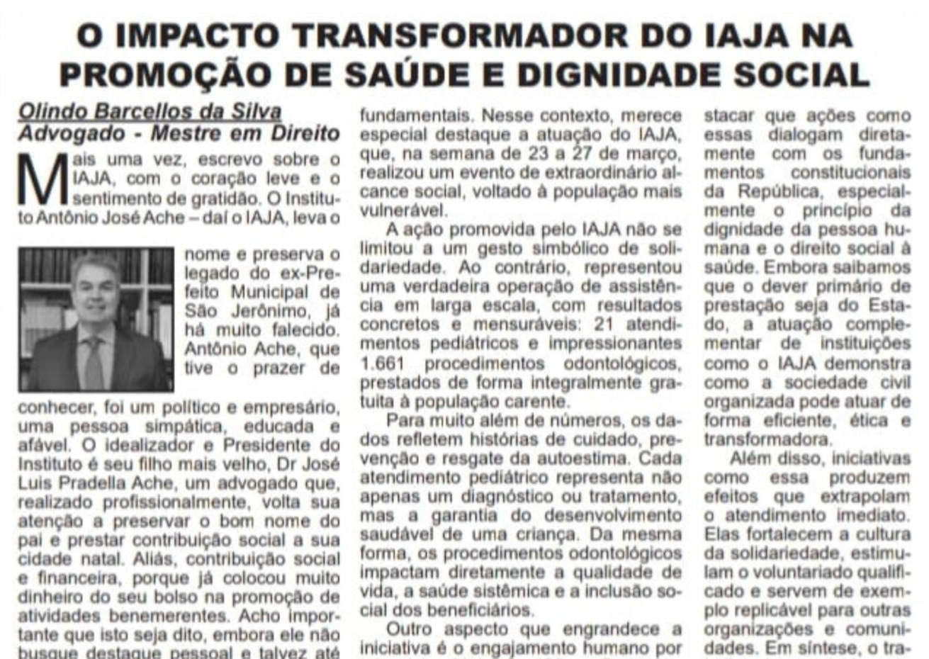 Mais uma vez, escrevo sobre o IAJA, com o coração leve e o sentimento de gratidão. O Instituto Antônio José Ache – daí o IAJA, leva o nome e preserva o legado do ex-Prefeito Municipal de São Jerônimo, já há muito falecido. Antônio Ache, que tive o prazer de conhecer, foi um político e empresário, uma pessoa simpática, educada e afável. O idealizador e Presidente do Instituto é seu filho mais velho, Dr. José Luis Pradella Ache, um advogado que, realizado profissionalmente, volta sua atenção a preservar o bom nome do pai e prestar contribuição social à sua cidade natal. Aliás, contribuição social e financeira, porque já colocou muito dinheiro do seu bolso na promoção de atividades benemerentes. Acho importante que isto seja dito, embora ele não busque destaque pessoal e talvez até fique chateado por esta revelação. Também é meritório, digno de louvor, o trabalho de dezenas de voluntário(a)s cuja única intenção é auxiliar a população econômica e socialmente carente. Participou do evento também a ONG “Por 1 Sorriso”, onde dentistas de destaque percorrer o país fazendo caridade ao atender a população economicamente mais pobre, sem cobrar um centavo. O conjunto destas duas instituições fez um evento de muito sucesso e estupendo alcance social.