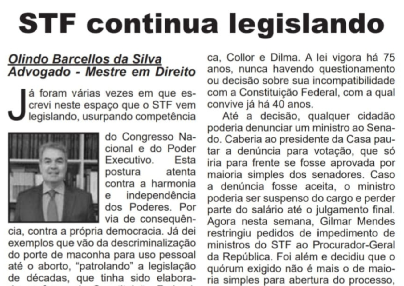 Já foram várias vezes em que escrevi neste espaço que o STF vem legislando, usurpando competência do Congresso Nacional e do Poder Executivo. Esta postura atenta contra a harmonia e independência dos Poderes. Por via de consequência, contra a própria democracia. Já dei exemplos que vão da descriminalização do porte de maconha para uso pessoal até o aborto, “patrolando” a legislação de décadas, que tinha sido elaborada na forma da Constituição Federal, tramitando pelos poderes Legislativo e Executivo. O Congresso Nacional assistiu passivamente, de joelhos, mais interessado nos bilionários fundos partidário e eleitoral e nas emendas ao orçamento, que garantem dinheiro, poder e a reeleição. Importante que se diga que parece ter havido entre os poderes da República uma vergonhosa troca tácita de competência legislativa por acesso a verbas orçamentárias. Posso parecer por demais contundente ou agressivo, mas é preciso que se parta disto para (tentar) entender a decisão monocrática do ministro Gilmar Mendes , que suspendeu artigos da lei de impeachment. A decisão foi proferida no âmbito de duas ADPFs (Arguições de Descumprimento de Preceito Fundamental) apresentadas pelo partido Solidariedade e pela AMB (Associação dos Magistrados Brasileiros). Esta lei, de 1950, foi usada no período de redemocratização até mesmo para o impedimento de dois Presidentes da República, Collor e Dilma. A lei vigora há 75 anos, nunca havendo questionamento ou decisão sobre sua incompatibilidade com a Constituição Federal, com a qual convive já há 40 anos.